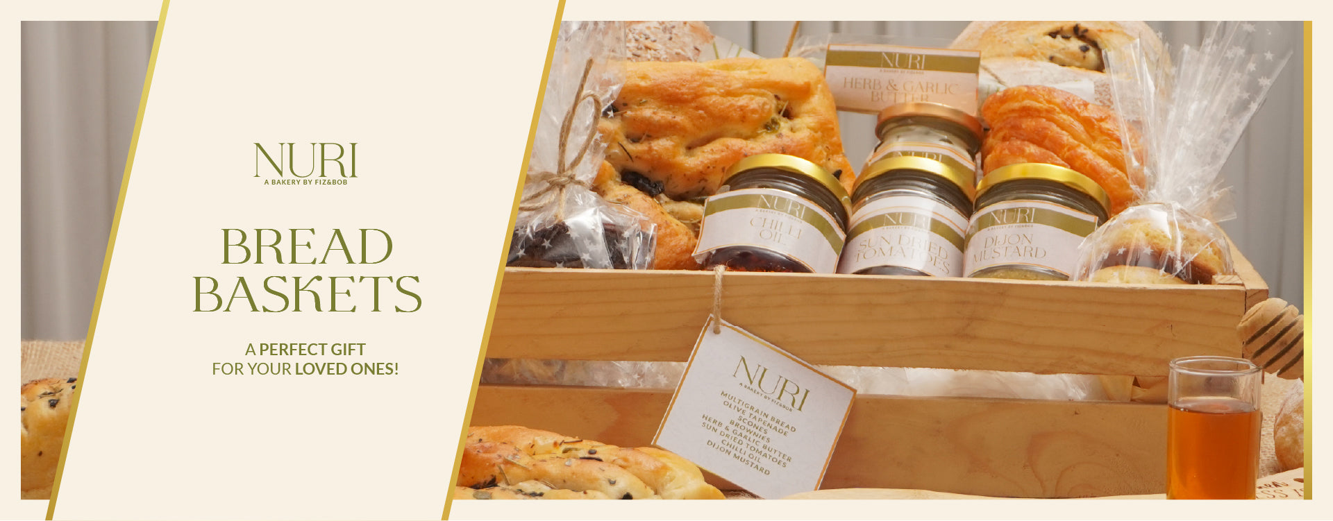 This basket includes Multigrain Bread, Croissant, Olive Tapenade, Scones, Brownies, Herb & Garlic Butter, Sun-Dried Tomatoes, Chilli Oil & Dijon Mustard.